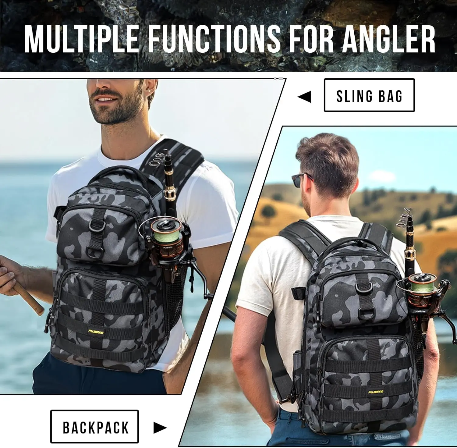 - Ultimate Waterproof & Comfortable Fishing Backpack: The fishing backpack features high-density waterproof material to keep gear dry in any weather. Its spacious interior offers ample storage, perfect for all fishing gear. Featuring multiple carrying options—single-shoulder sling or dual-shoulder backpack—it ensures versatility and comfort. The ergonomic design includes a padded back panel and adjustable straps, making it ideal for all-day fishing adventures and outdoor activities.