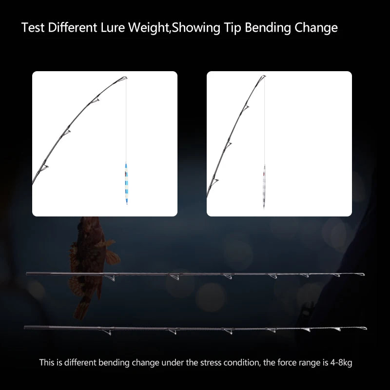 Legnth: 1.8m|Closed Length: 95cm|Weight: 208g|Lure Weight (Hollow/Solid): 80-250g|Line Weight: 20-50lb|Action : Fast |Power : MH|Bottom Diameter : 12.75mm|Top Diameter : 2.2mm|Section: 2|